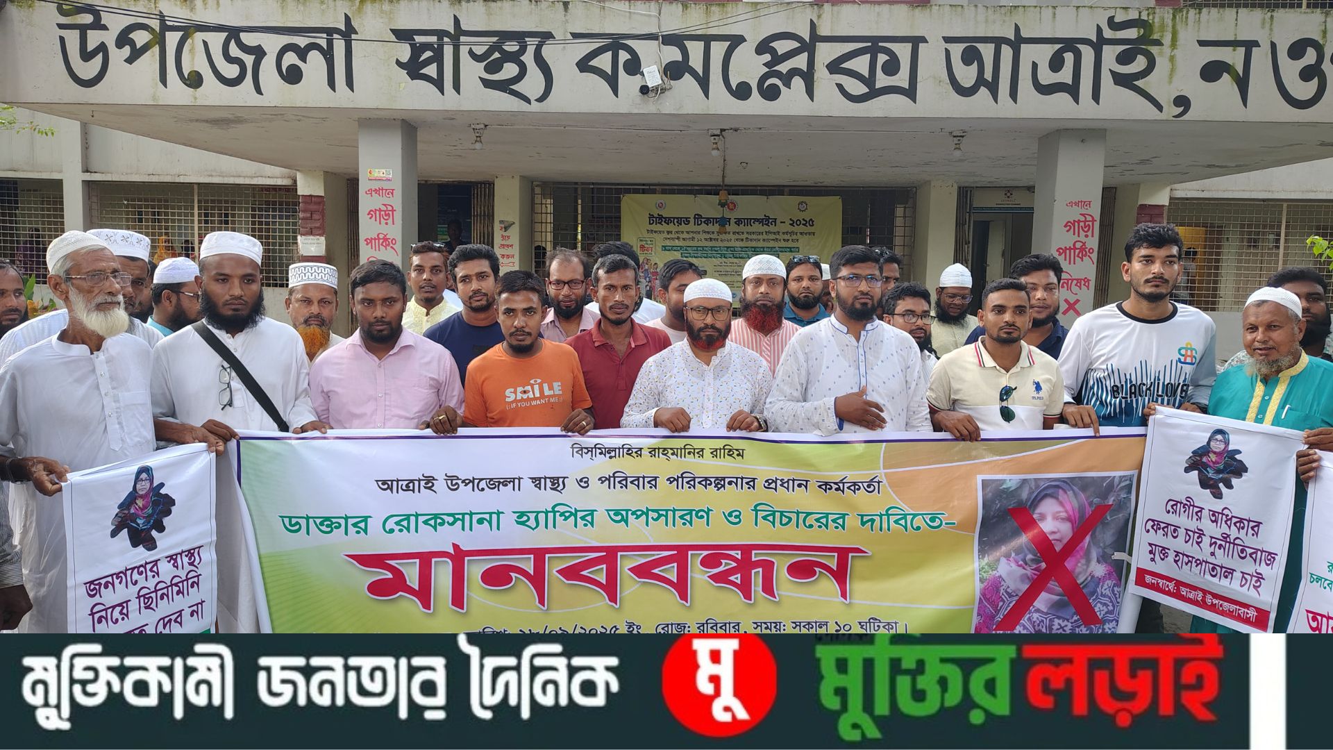 নওগাঁর আত্রাই উপজেলা স্বাস্থ্য ও পরিবার পরিকল্পনা কর্মকর্তা ডা. রোকসানা হ্যাপীর বিরুদ্ধে নানামুখী অনিয়ম ও দুর্নীতির অভিযোগ এনে তাকে অবিলম্বে অপসারণ ও বিচারের দাবিতে মানববন্ধন অনুষ্ঠিত হয়েছে।