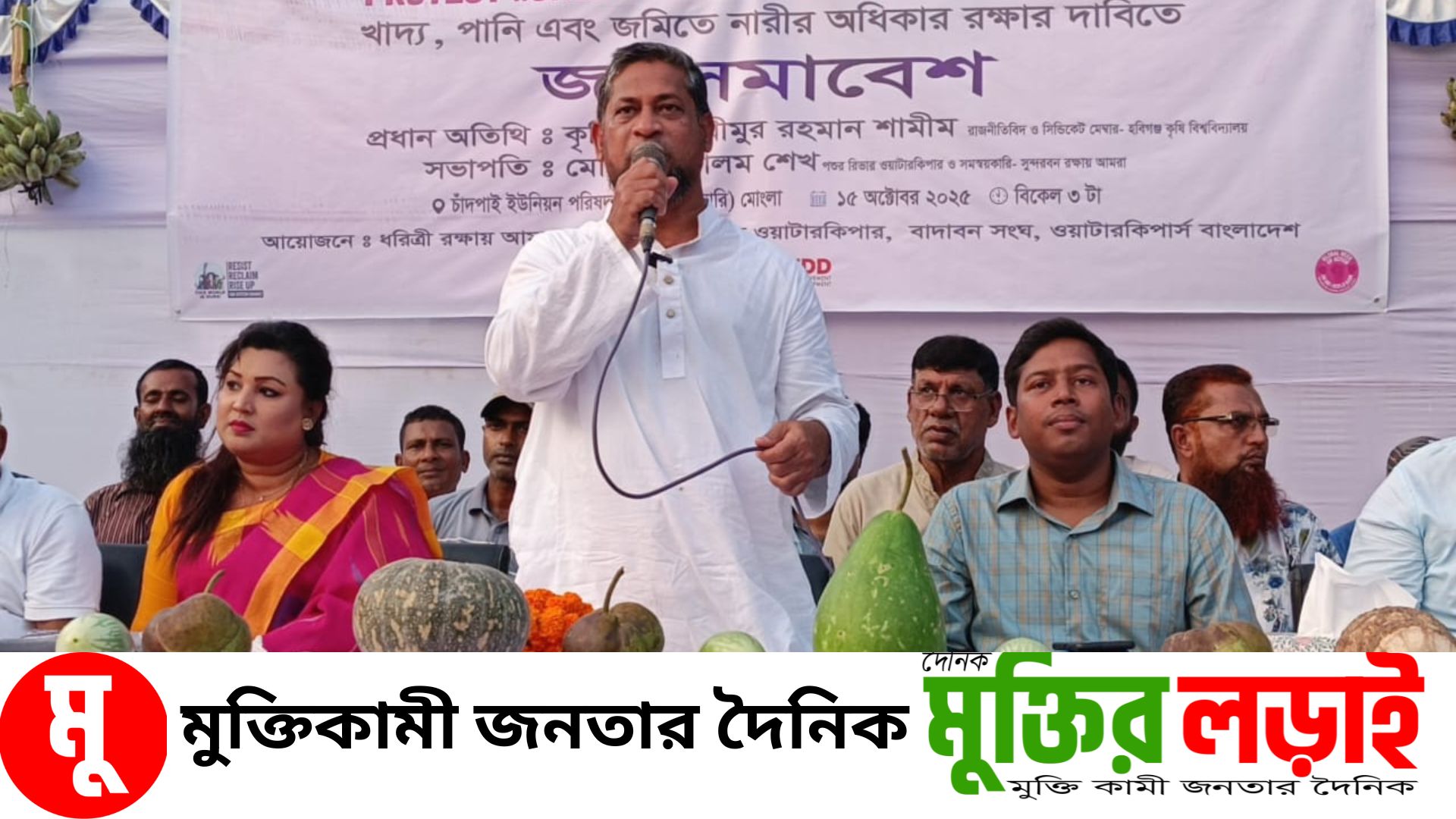 বুধবার (১৫ অক্টোবর) বিকেলে বাগেরহাটের মোংলার কাইনমারিতে চাঁদপাই ইউনিয়ন পরিষদ চত্বরে অনুষ্ঠিত “খাদ্য, পানি ও জমিতে নারীর অধিকার” শীর্ষক জনসমাবেশে প্রধান অতিথির বক্তৃতায় তিনি এসব কথা বলেন।