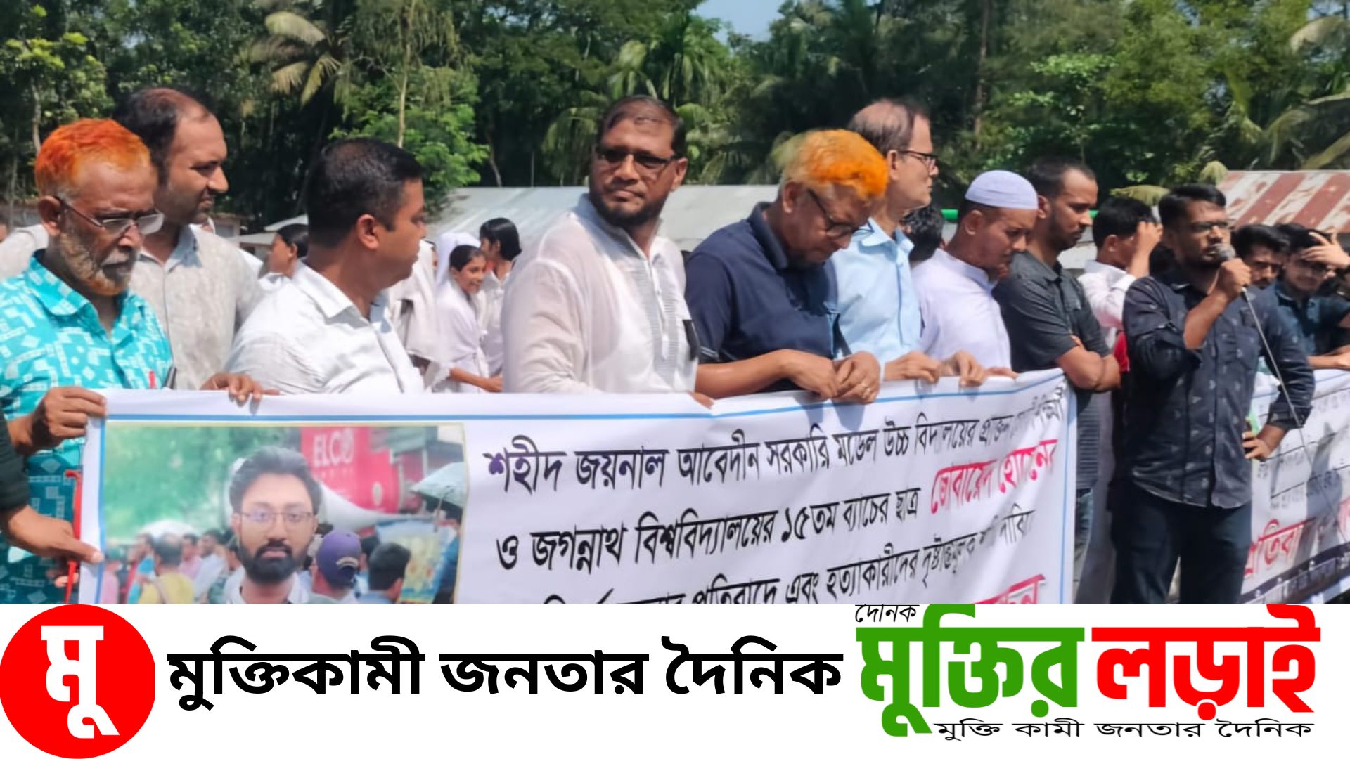 নোয়াখালীর সুবর্ণচর উপজেলার শহীদ জয়নাল আবেদীন সরকারি মডেল উচ্চ বিদ্যালয়ের ২০১৭ সালের (প্রাক্তন) শিক্ষার্থী ও জগন্নাথ বিশ্ববিদ্যালয়ের ১৫তম ব্যাচের ছাত্র জোবায়েদ হোসেনের হত্যার প্রতিবাদে মানববন্ধন অনুষ্ঠিত হয়েছে।