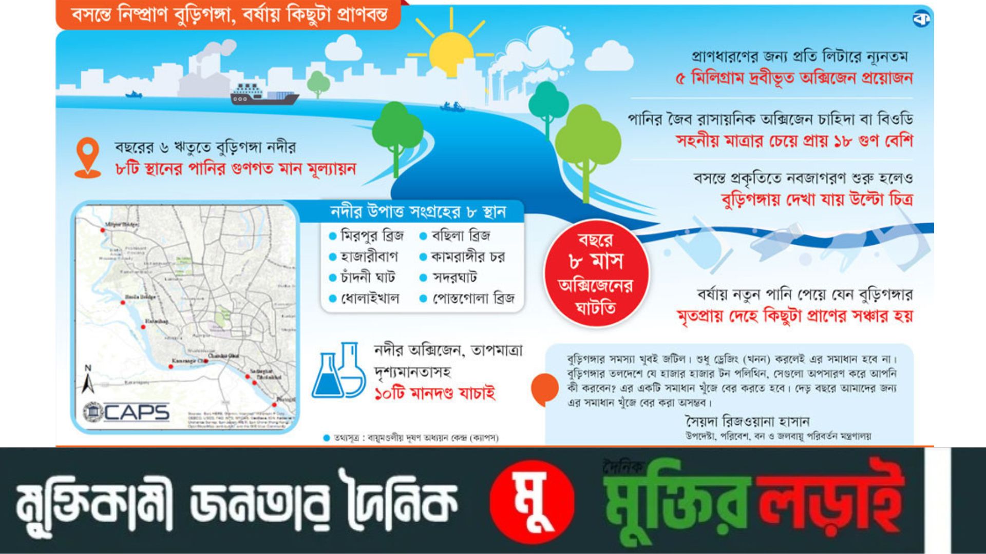 শুকনা মৌসুমে নোংরা জলে ভয়ানক দুর্গন্ধ ছোটে। বায়ুমণ্ডলীয় দূষণ অধ্যয়ন কেন্দ্রের (ক্যাপস) করা এক গবেষণায় বুড়িগঙ্গার ঋতুভিত্তিক দূষণের চিত্র উঠে এসেছে।