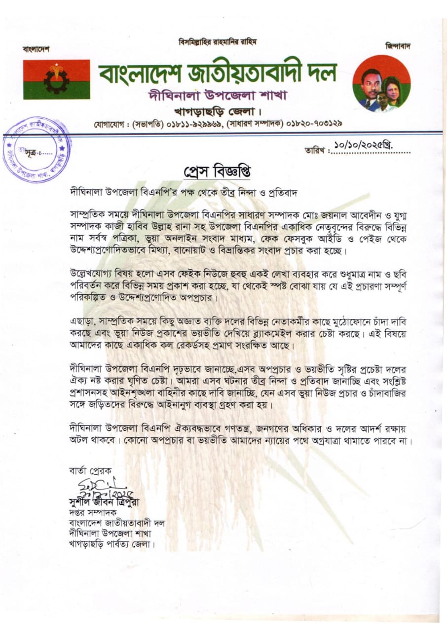 খাগড়াছড়ি জেলার দীঘিনালা উপজেলা বিএনপির দপ্তর সম্পাদক সুশীল জীবন ত্রিপুরা স্বাক্ষরিত এক সংবাদ বিজ্ঞপ্তিতে বলা হয়, সম্প্রতি উপজেলা বিএনপির সাধারণ সম্পাদক মো. জয়নাল আবেদীন ও যুগ্ম সম্পাদক কাজী হাবিবউল্লাহ রানা এর বিরুদ্ধে উদ্দেশ্যমূলকভাবে অপপ্রচার চালানো হচ্ছে।