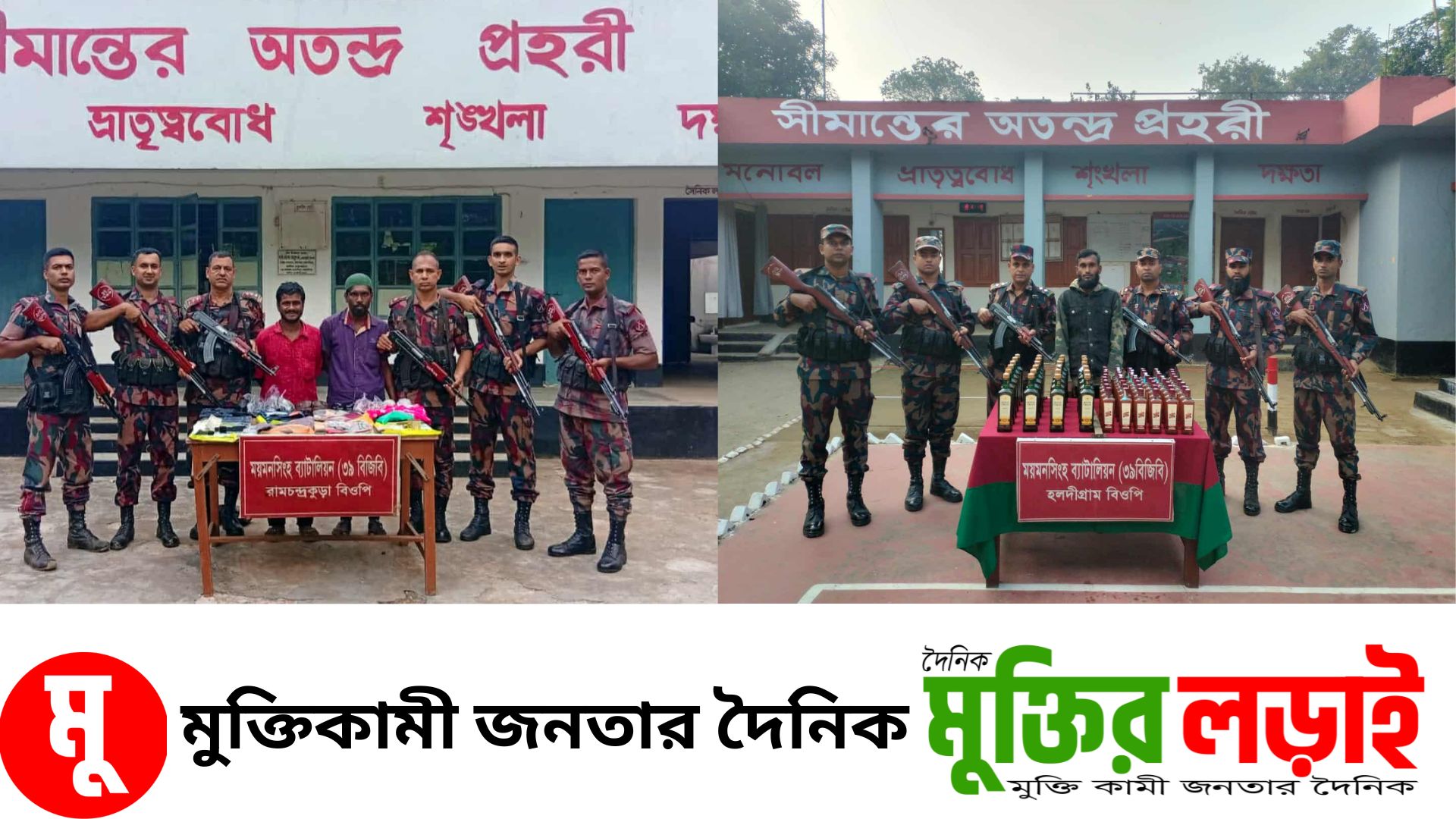শেরপুর–ময়মনসিংহ সীমান্তে বিপুল পরিমাণ ভারতীয় মদ ও চোরাচালানী মাল জব্দ