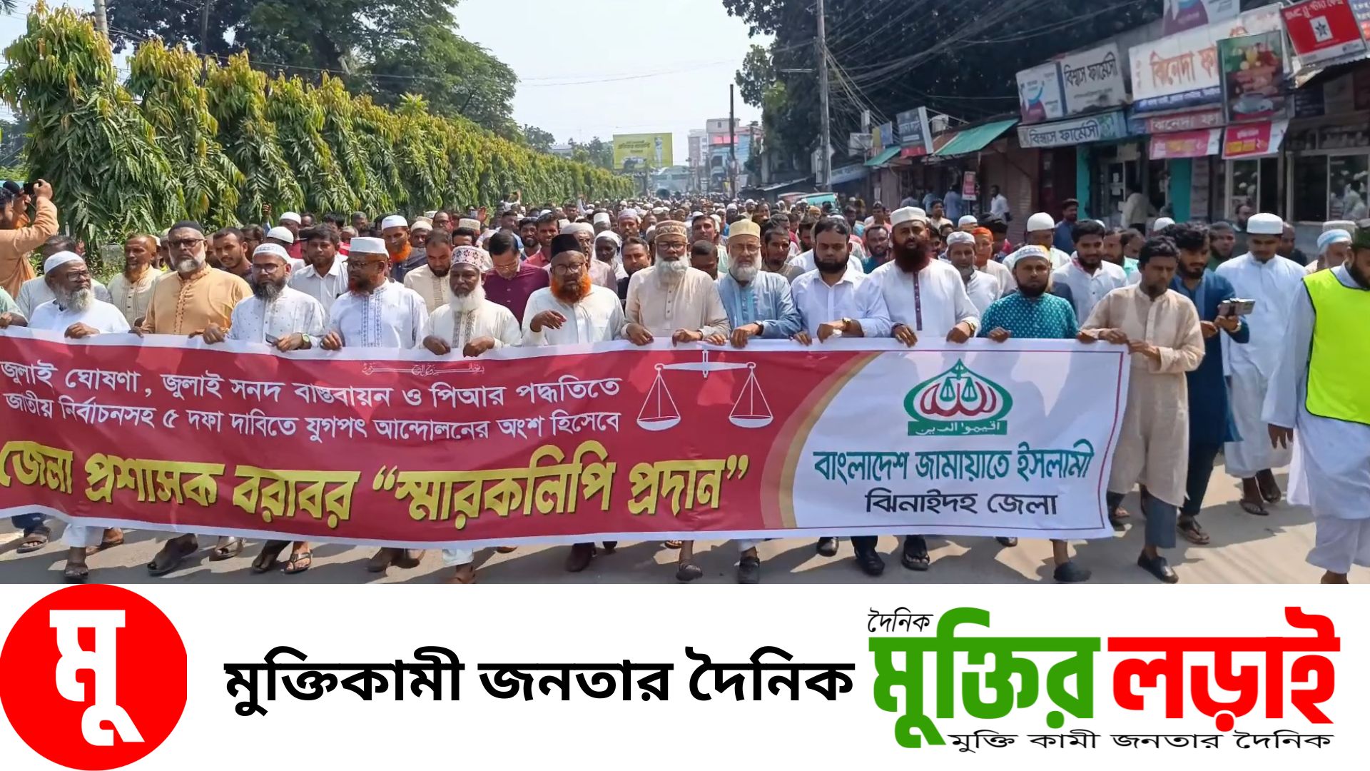 রোববার সকালে শহরের কেন্দ্রীয় শহীদ মিনার চত্বর থেকে জেলা জামায়াতের পক্ষ থেকে একটি র্যালি বের করা হয়। র্যালিটি ঝিনাইদহ-চুয়াডাঙ্গা মহাসড়কের বিভিন্ন স্থান প্রদক্ষিণ করে জেলা প্রশাসকের কার্যালয়ের সামনে গিয়ে শেষ হয়। পরে তাদের দাবি-সংবলিত স্মারকলিপি জেলা প্রশাসকের মাধ্যমে প্রধান উপদেষ্টা বরাবর পেশ করেন।