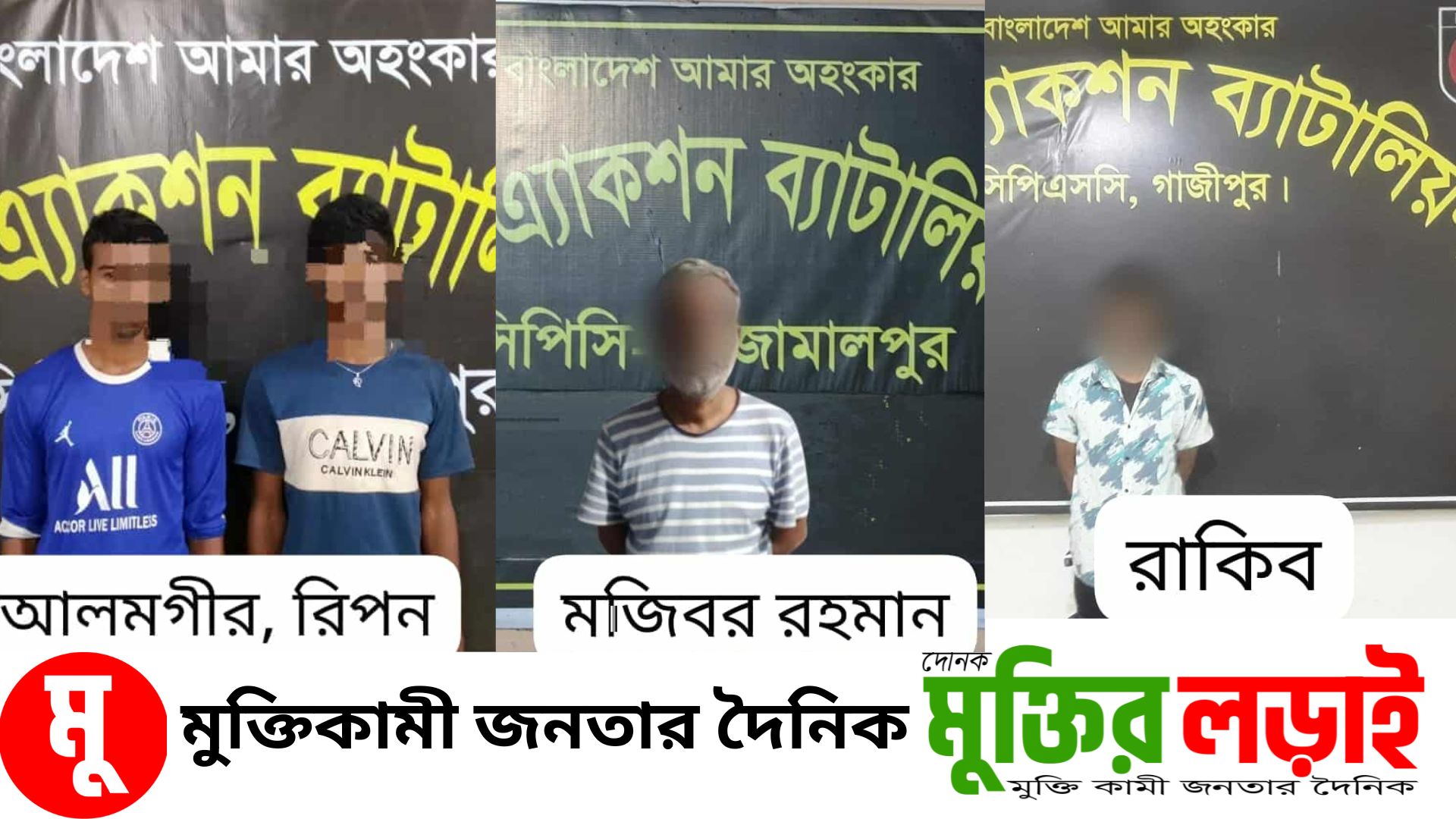 র্যাপিড অ্যাকশন ব্যাটালিয়ন (র্যাব)–১৪, জামালপুর ক্যাম্প (সিপিসি-১) কর্তৃক পরিচালিত তিনটি পৃথক অভিযানে হত্যা ও মাদক মামলার চারজন আসামীকে গ্রেফতার করা হয়েছে। এদের মধ্যে তিনজন মাদক মামলার আসামী এবং একজন হত্যা মামলার ওয়ারেন্টভুক্ত পলাতক আসামী।