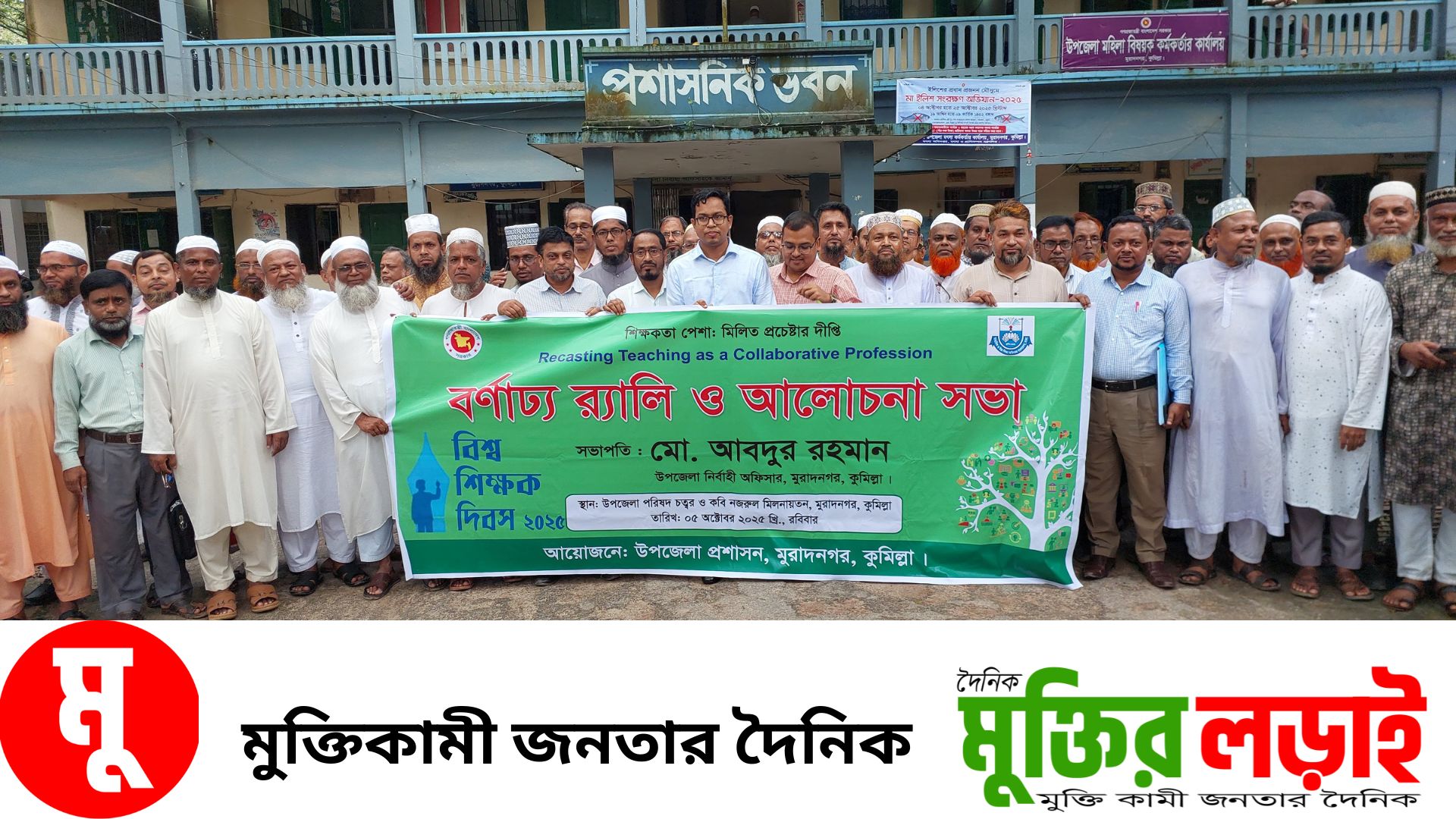 “শিক্ষকতা পেশা: মিলিত প্রচেষ্টার দীপ্তি” এই প্রতিপাদ্যকে সামনে রেখে কুমিল্লার মুরাদনগরে বিশ্ব শিক্ষক দিবস উপলক্ষে এক বর্ণাঢ্য র্যালি ও আলোচনা সভা অনুষ্ঠিত হয়েছে। রবিবার (৫ অক্টোবর) সকালে উপজেলা প্রশাসনের আয়োজনে একটি বর্ণাঢ্য র্যালি উপজেলা প্রাঙ্গণ থেকে বের হয়ে উপজেলা সদরের প্রধান প্রধান সড়ক প্রদক্ষিণ শেষে কবি নজরুল মিলনায়তনে এক আলোচনা অনুষ্ঠিত হয়।