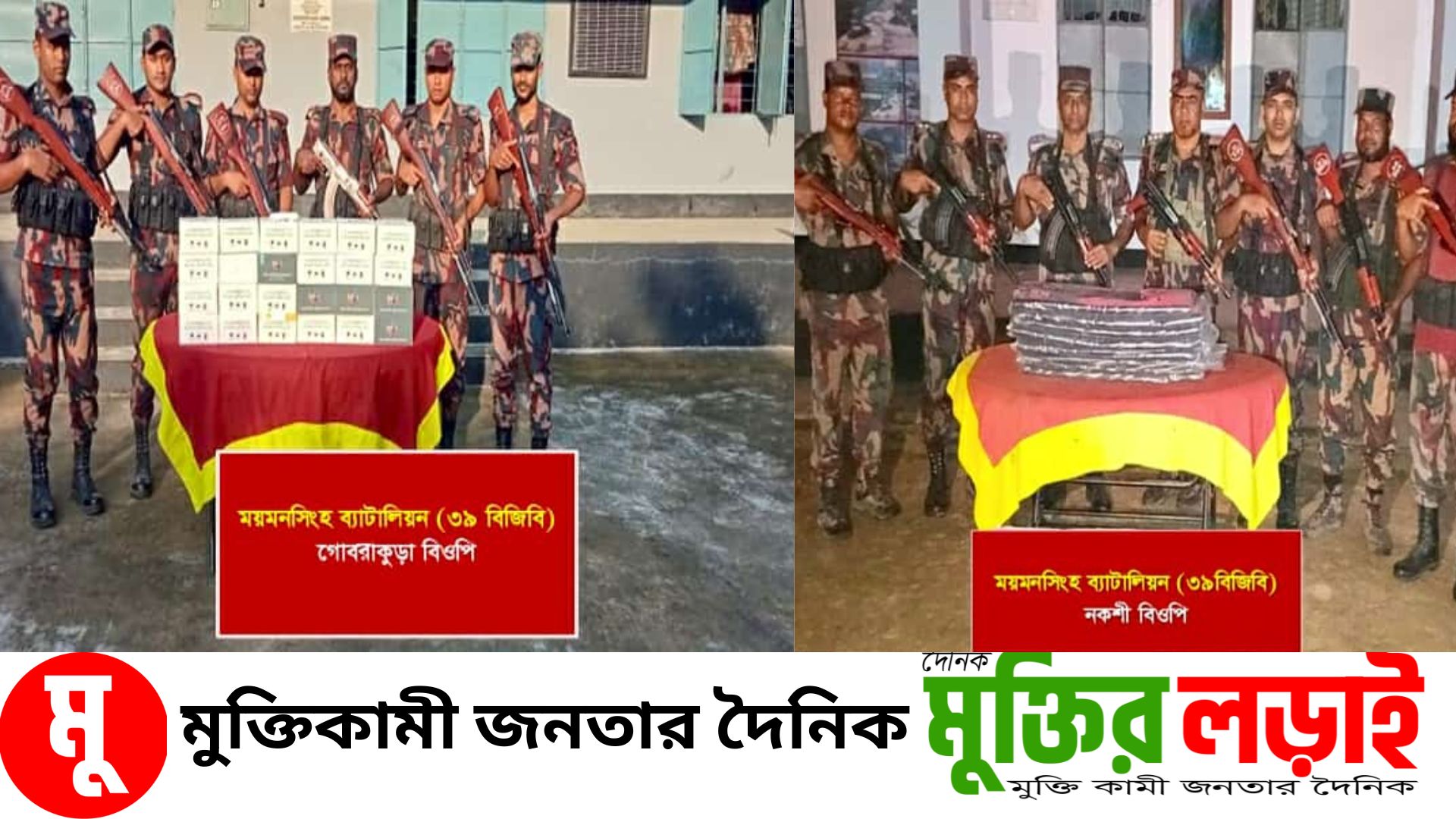 ময়মনসিংহ ব্যাটালিয়ন (৩৯ বিজিবি)-এর পৃথক অভিযানে ময়মনসিংহের হালুয়াঘাট ও শেরপুরের ঝিনাইগাতী সীমান্ত এলাকা থেকে বিপুল পরিমাণ ভারতীয় মোবাইল ডিসপ্লে ও গজ কাপড় জব্দ করা হয়েছে। গোপন সংবাদের ভিত্তিতে গত ১৫ অক্টোবর রাতে গোবরাকুড়া ও গজনী সীমান্তে অভিযান চালিয়ে বিজিবি সদস্যরা এসব পণ্য আটক করেন।