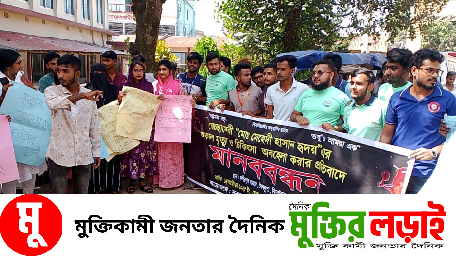 মানববন্ধনে বক্তারা বলেন, স্বেচ্ছাসেবী মেহেদী হাসান হৃদয় এর চিকিৎসায় অবহেলার কারনে মৃত্যু তার হয়েছে। এছাড়াও হাসপাতালে বিভিন্ন ধরনের অনিয়ম ও দূর্নীতিতে ছেয়ে গেছে।