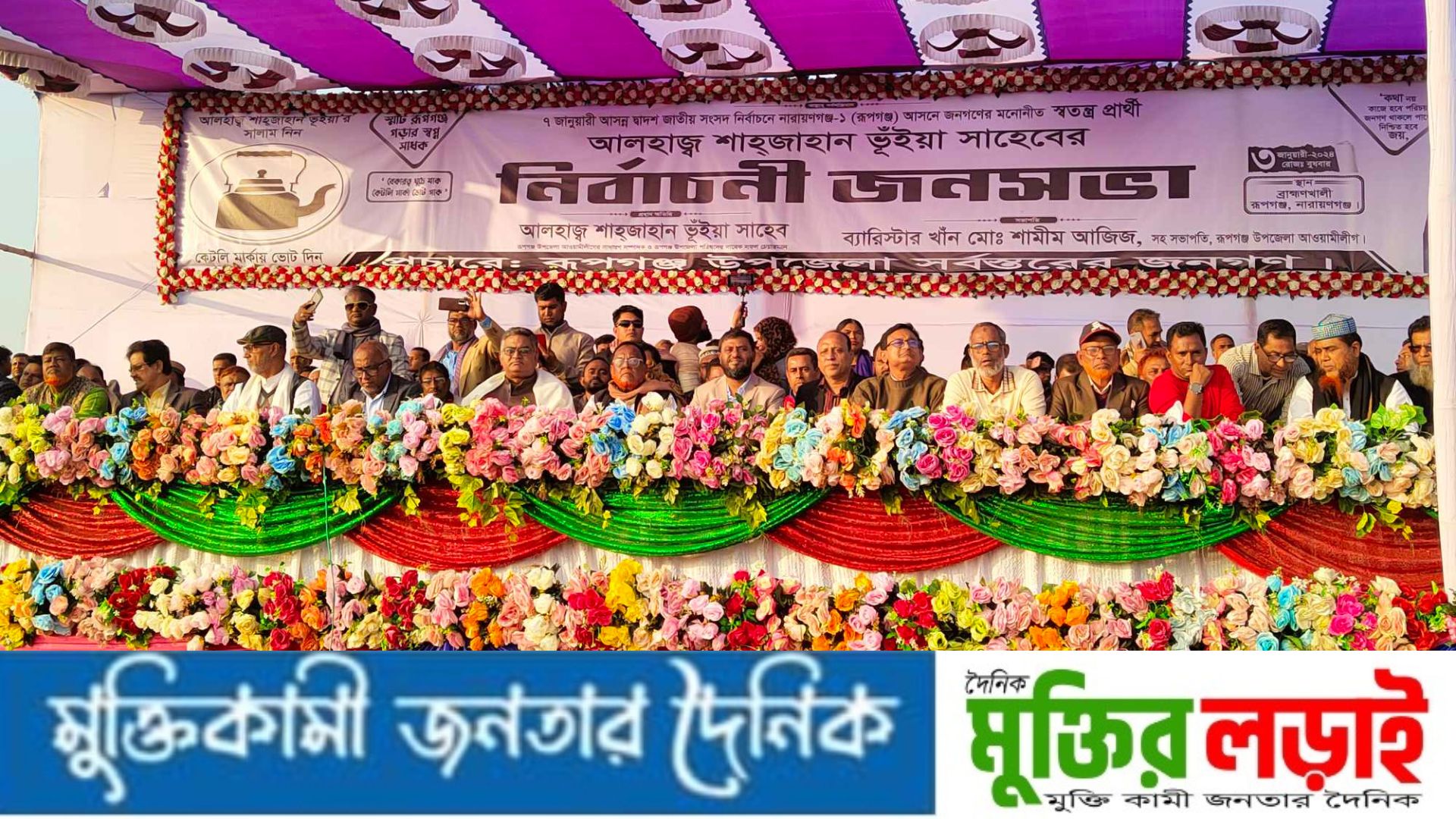 রাকিবুল ইসলাম, রূপগঞ্জ (নারায়ণগঞ্জ) নারায়নগঞ্জ-১ রূপগঞ্জ আসনে স্বতন্ত্র প্রার্থী কেটলি প্রতীকে নির্বাচনী জনসভা ও আনন্দ মিছিল করেন উপজেলা আওয়ামীলীগের সাধারণ