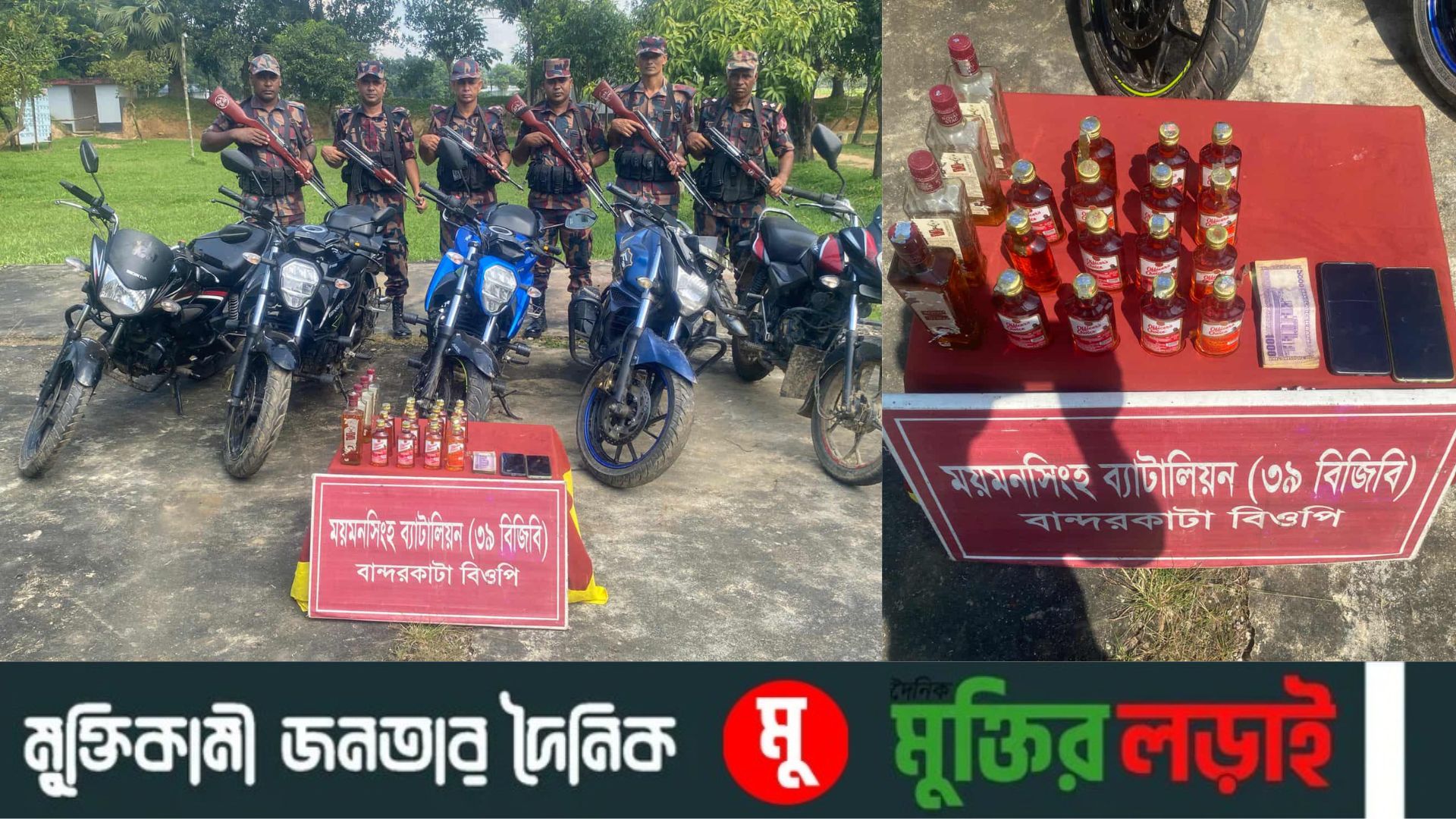 ময়মনসিংহ সীমান্তে তেরো লক্ষাধিক টাকার ভারতীয় মদ ও মোটরসাইকেল আটক