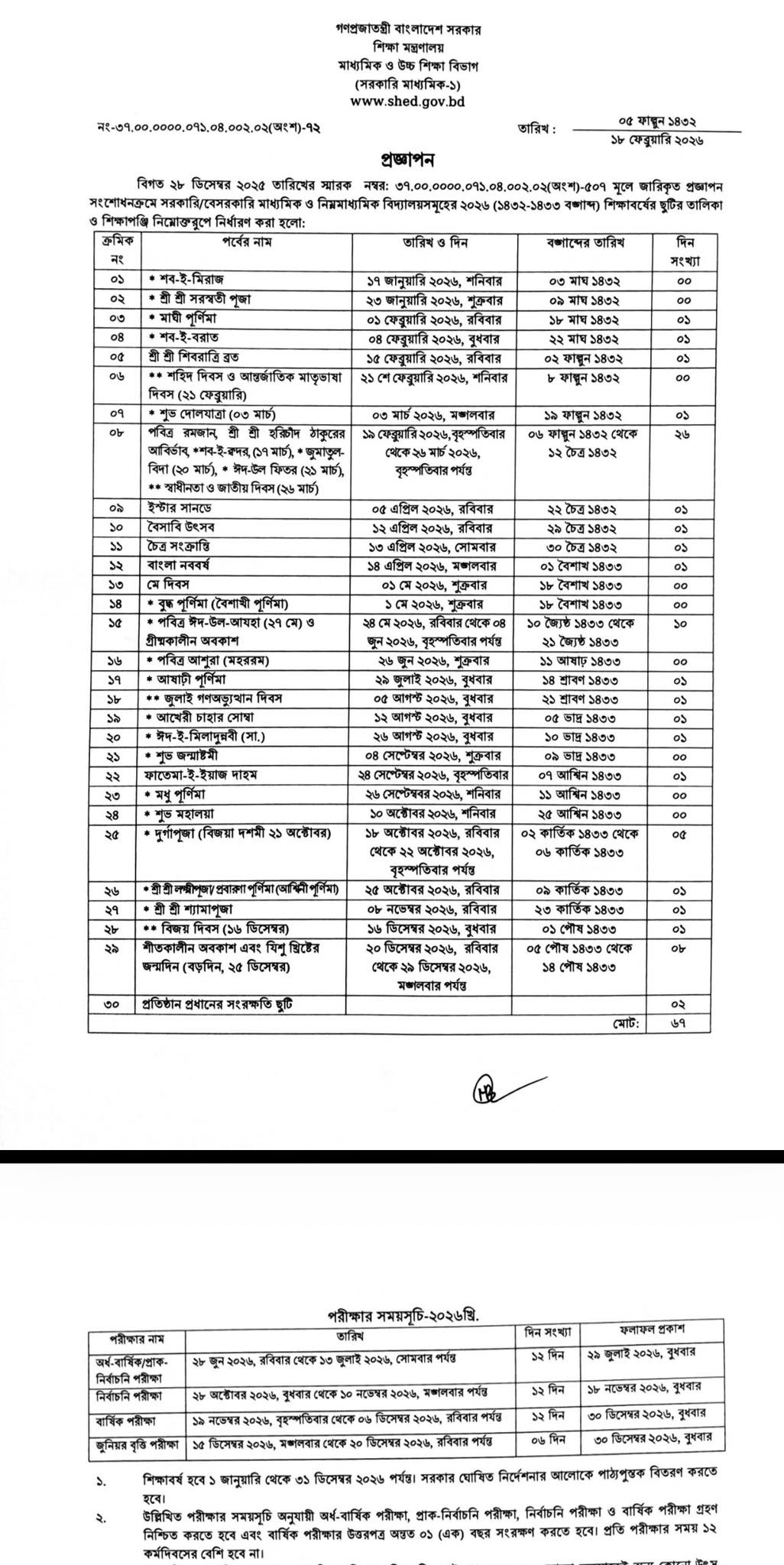 সংশোধিত তালিকা অনুযায়ী, বৃহস্পতিবার (১৯ ফেব্রুয়ারি) থেকে প্রাথমিক ও মাধ্যমিক সব ধরনের বিদ্যালয় বন্ধ থাকবে। এই ছুটি চলবে আগামী ২৬ মার্চ পর্যন্ত। এ ক্ষেত্রে ২৬ মার্চ বৃহস্পতিবার হওয়ায় পরের ২ দিন (শুক্র-শনি) ছুটি কাটাতে পারবেন শিক্ষক-কর্মচারীরা।