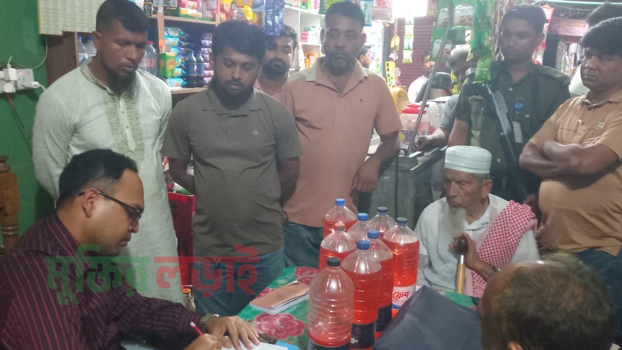 এ সময় অবৈধভাবে জ্বালানি মজুদ ও অতিরিক্ত মূল্যে তেল বিক্রয়ের অভিযোগ প্রমাণিত হওয়ায় হাজী লতিফ স্টোর এর স্বত্ত্বাধিকারী আমির হোসেনকে পেট্রোলিয়াম বিধিমালা ২০১৮ এর বিধি ১২০, পেট্রোলিয়াম আইন ২০১৬ এর ২০ ধারায় ২০০০/- (দুই হাজার টাকা) জরিমানা ও তৎক্ষনাৎ আদায় করা হয় এবং অবৈধ ১৫ লি. তেল জব্দ করা হয়।